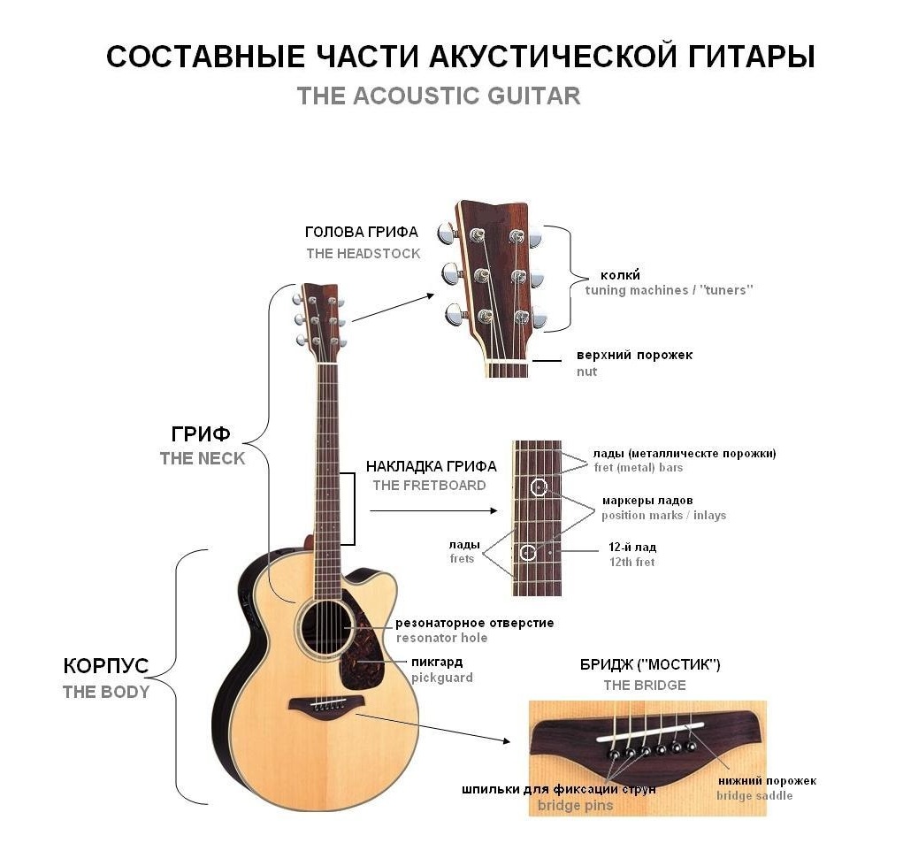 Итак, для игры на гитаре нам требуется узнать из чего она состоит.